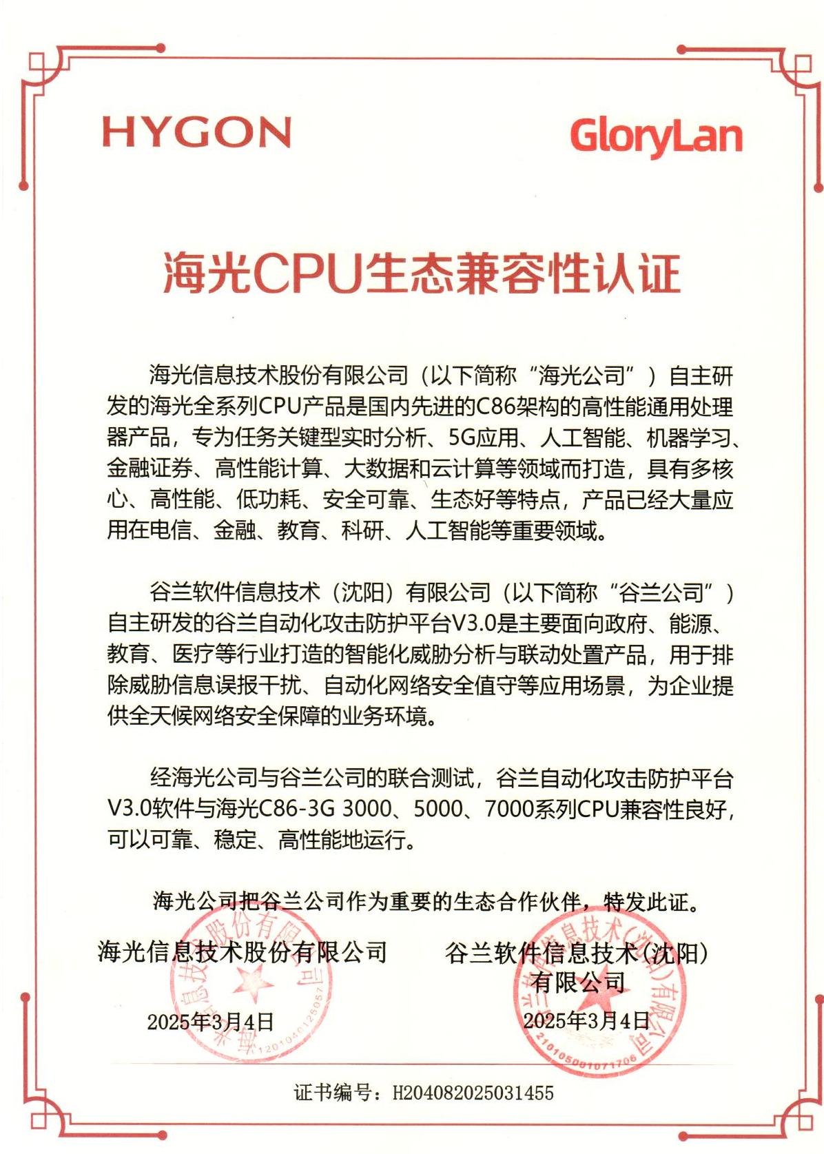 2025年3月,谷兰自主研发的联防联控系统V3.0、自动化攻击防护平台V3.0正式通过海光(Hygon)处理器与华为鲲鹏(Kunpeng)技术平台的兼容性互认证。此次认证覆盖产品功能、性能及安全性全维度,标志着谷兰软件在国产化信息技术应用创新领域迈入行业前列,为党政、教育、医疗等关键领域提供自主可控的网络安全解决方案。